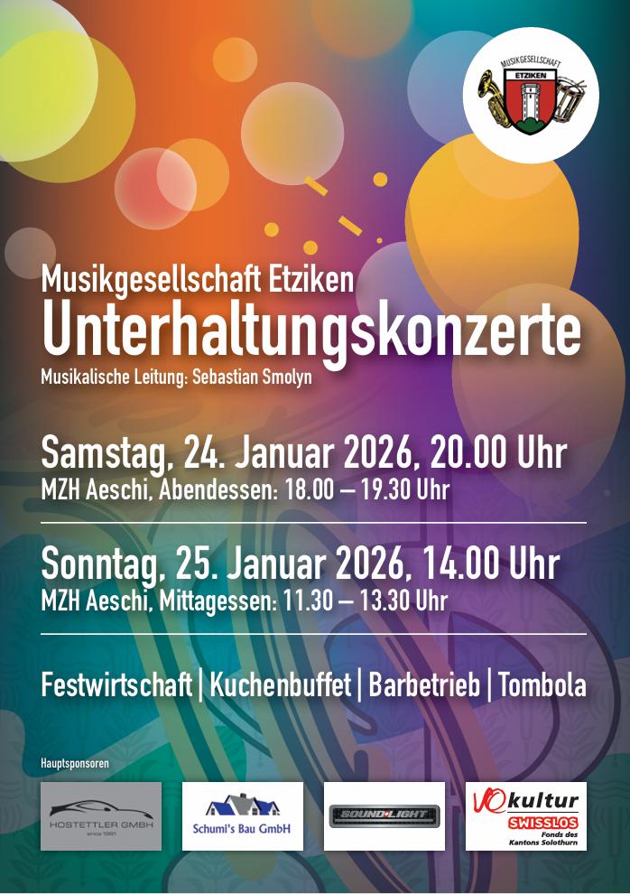Am 24./25. Januar 2026 finden die Unterhaltungskonzerte der Musikgesellschaft Etziken in der MZH Aeschi statt.
